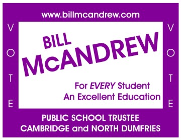 running for the office of Public School Trustee - Cambridge and North Dumfries. If elected, I will work very diligently